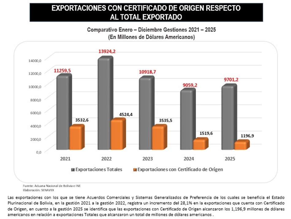BOLIVIA: EXPORTACIONES CON CERTIFICADOS DE ORIGEN RESPECTO AL TOTAL EXPORTADO Comparativo Enero – Diciembre Gestiones 2021-2025 (En millones de dólares americanos) 2020-03-26