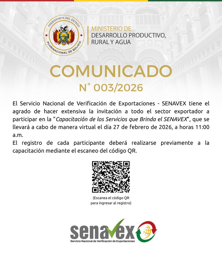 El Servicio Nacional de Verificación de Exportaciones – SENAVEX tiene el agrado de hacer extensiva la invitación a todo el sector exportador a participar en la Capacitación de los Servicios que Brinda.