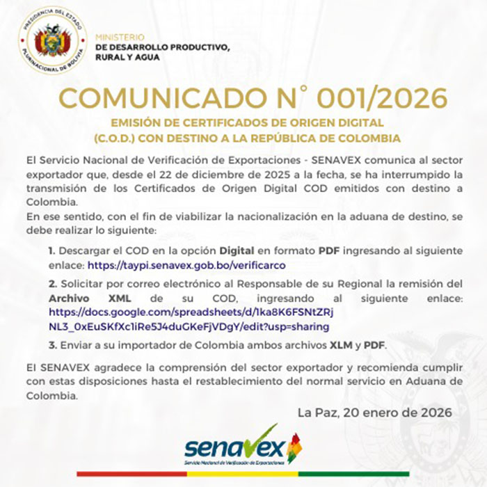 El Servicio Nacional de Verificación de Exportaciones – SENAVEX tiene a bien comunicar al sector exportador en general que a partir del miércoles 1O de Julio y hasta nuevo aviso todas las solicitudes de Emisión de Certificado de Origen de la Regional de Registro y Certificación de Origen Potosí, serán atendidos por la Regional de Registro y Certificación de Origen Sucre.