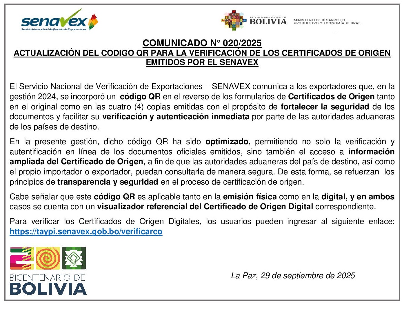De igual manera, para mayor información y obtención de guías para el usuario se puede comunicar con el correo institucional que atiende servicios de certificaciones de Sello Hecho en Bolivia (SHEB): certificaciones@senavex.gob.bo o bien con la línea telefónica (2) 2113621 interno 120.