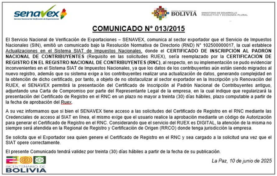 TOMAR EN CUENTA. Para obtener el RUEX y una vez que cuente con los documentos requisito, ingrese a taypi.senavex.gob.bo.